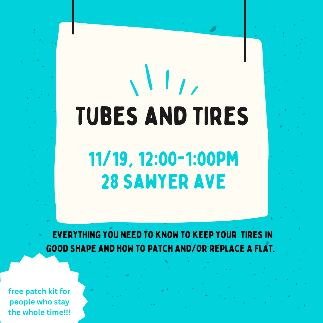 Join us on November 19th from noon to 1 to learn everything you need to know to keep your bicycle tires in good shape and learn how to patch and/or replace a flat!