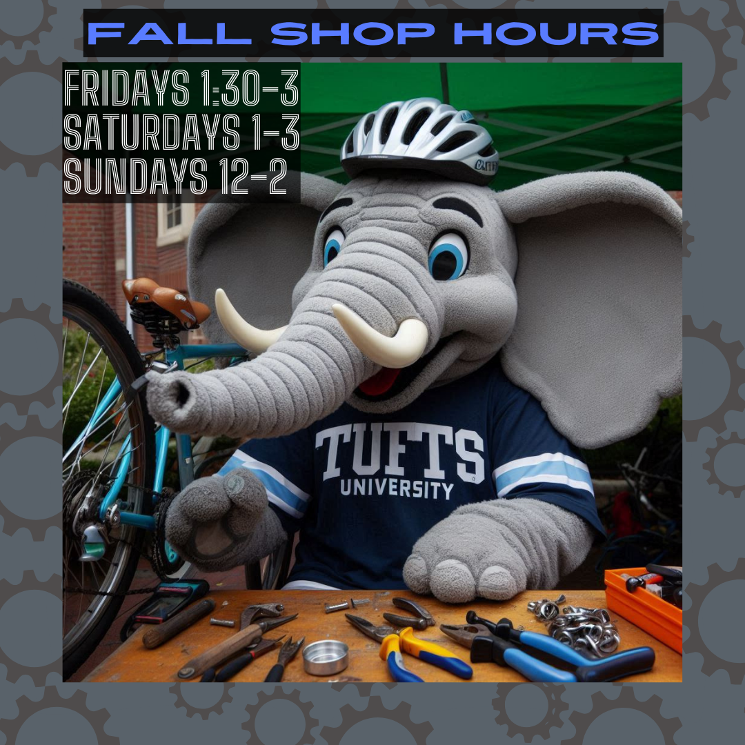 Tufts Bikes is closed for the summer! Keep an eye out for our fall mechanic hours a few weeks into the semester. Until then, enjoy the summer and happy biking!